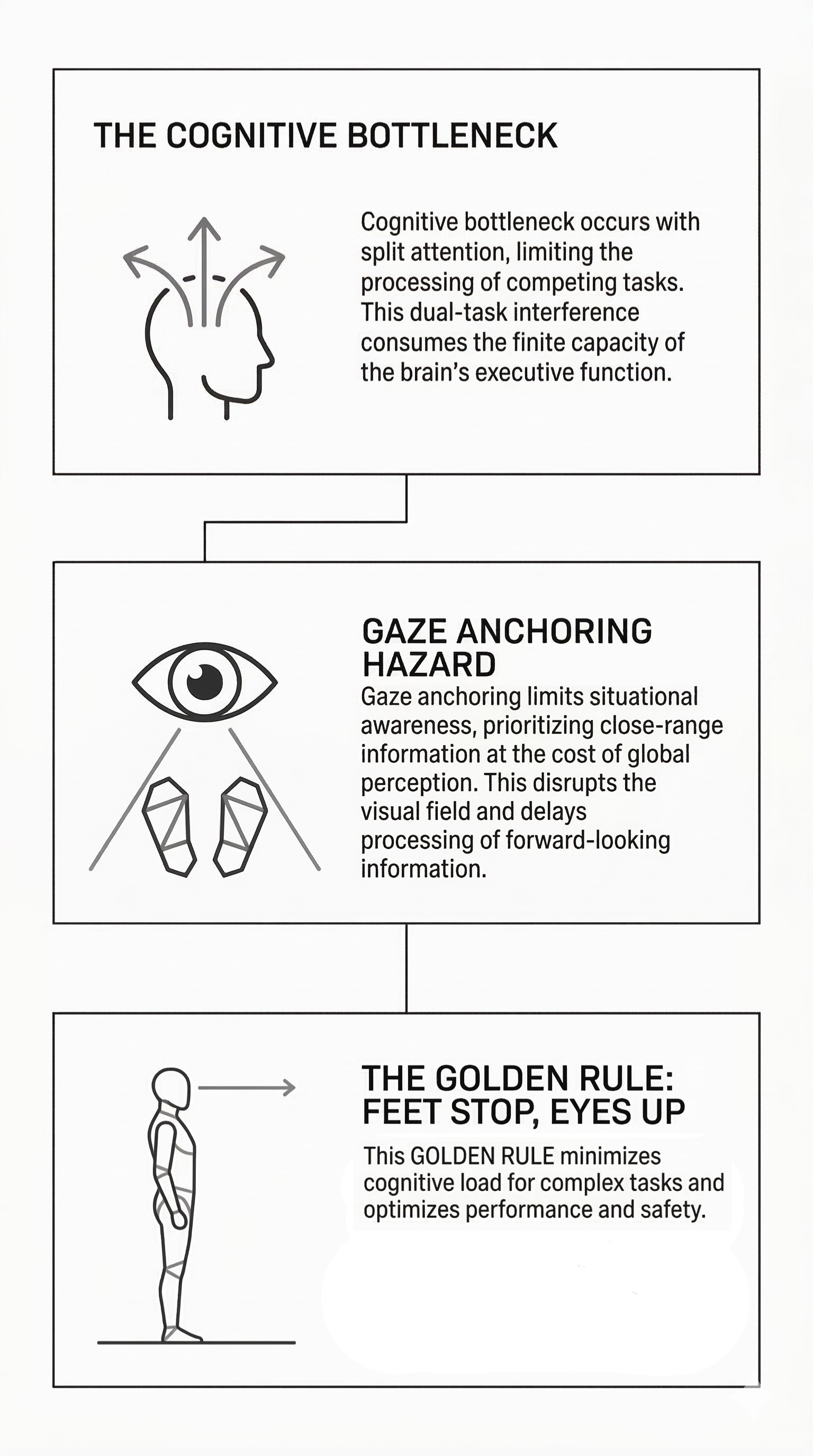 While this creates a false sense of security, it is highly destructive to physical mechanics. Postural stability relies heavily on peripheral vision and "optical flow"—the pattern of motion across the visual field that detects bodily sway. By anchoring their gaze to the floor, the individual restricts this critical sensory data stream. They become vastly more visually dependent and inherently unstable, leading to a stiff, cautious, and shuffling gait that paradoxically guarantees a higher risk of future falls.